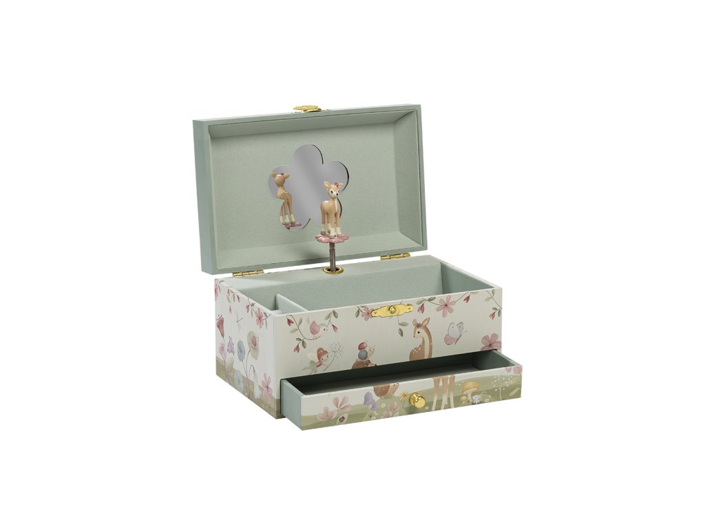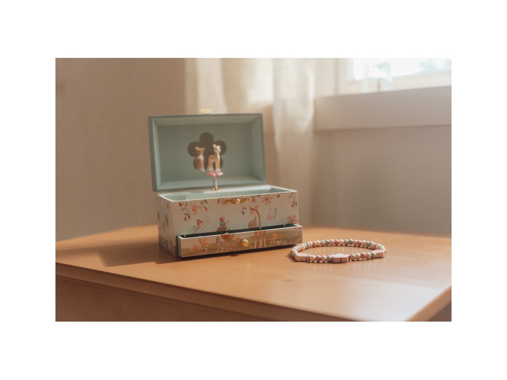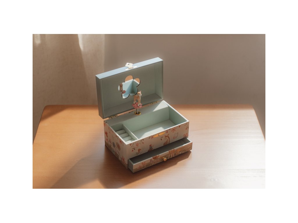Krásná šperkovnice se zrcátkem a hudebním boxem, který po natažení hraje něžnou melodii. Vaše malá parádnice si do šperkovnice s potiskem motivů ze života v lese může ukládat své šperky a jiné vzácné drobnosti.