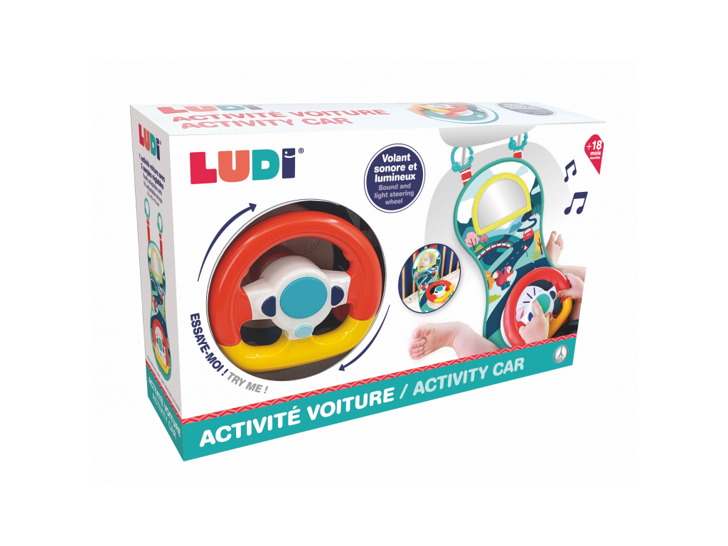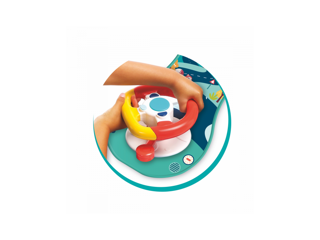 Interaktivní hrací pultík zabaví vaše dítě na cestách autem. Volant nabízí tlačítka se zvuky startování, klaksonu a blinkrů, pozornost dítěte upoutá i bezpečné zrcátko.