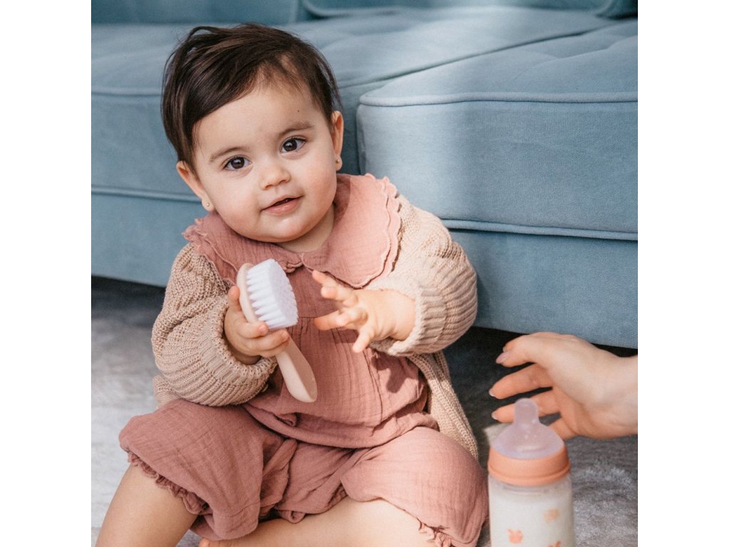 Set hřebenu a kartáčku je ideálním pomocníkem pro každodenní péči o vlásky děťátka. Dopřejte jemnou masáž i miminku, které má jen jemné chmýří. Kartáč i hřeben jsou bez ostrých a nebezpečných hran, které by mohly být dítěti nebezpečné. Zuby hřebínku mají zaoblené konce a vlákna kartáčku jsou měkoučké a pružné. Ideální pro jemnou dětskou pokožku i vlásky, vhodné pro miminka od narození.