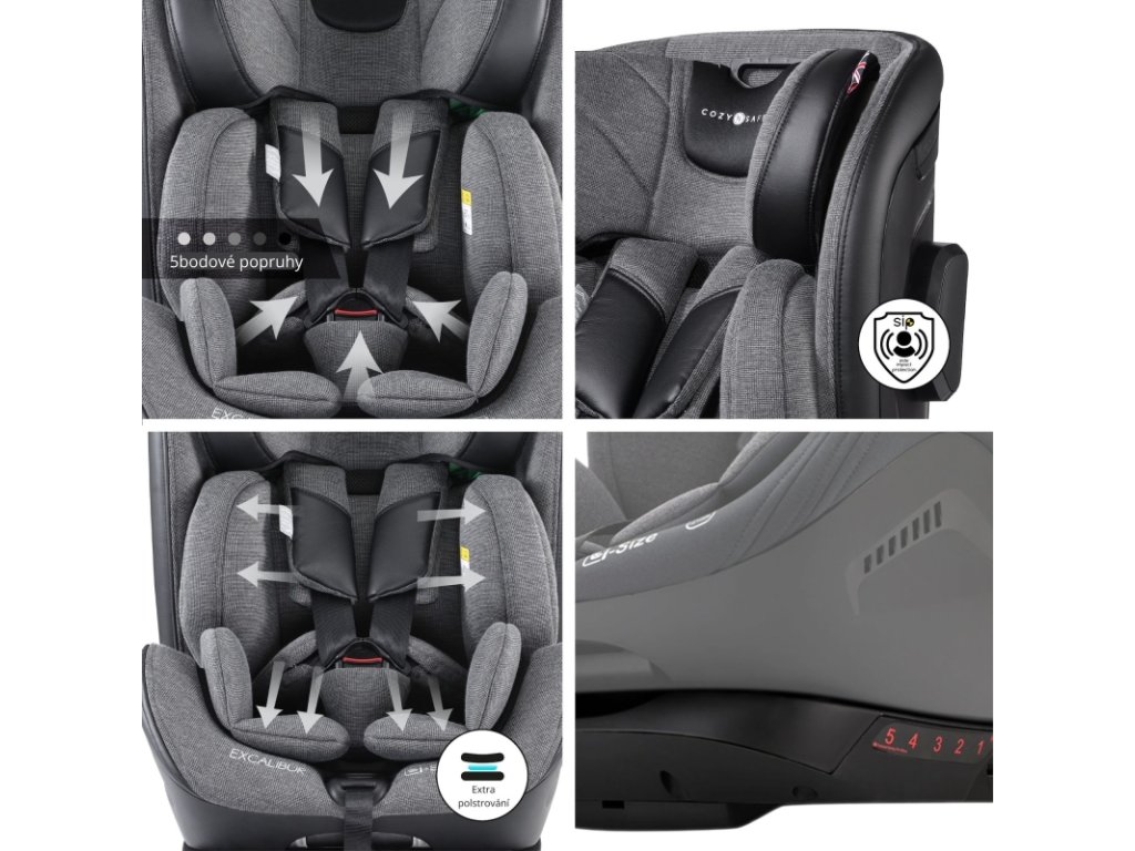 Autosedačka Excalibur je uzpůsobena rostoucím dětem – její prodloužený systém pásů zajistí bezpečné a pohodlné používání až do 125 cm výšky. Dále je vybavena 5polohovým naklápěním, které je schváleno pro všechny věkové fáze, takže vaše dítě bude vždy cestovat v pohodlné poloze.