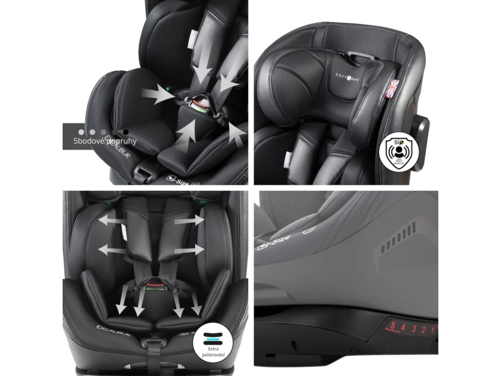 Jednou z hlavních předností modelu Excalibur i-Size jsou integrované 5bodové bezpečnostní popruhy, které lze používat až do výšky 125 cm (cca 6 let), a zajišťují tak bezpečné připoutání dítěte po mnoho let. Zároveň se pyšní titulem první autosedačky na světě s i-Size schválením podle švédské normy E5, což garantuje mimořádně přísné bezpečnostní standardy.