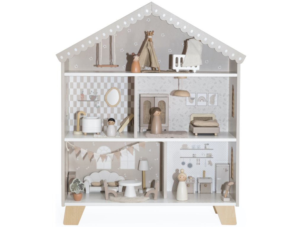 Vstupte do světa fantazie a tvořivé hry s tímto moderním dřevěným domečkem pro panenky, který potěší a inspiruje dětskou představivost.