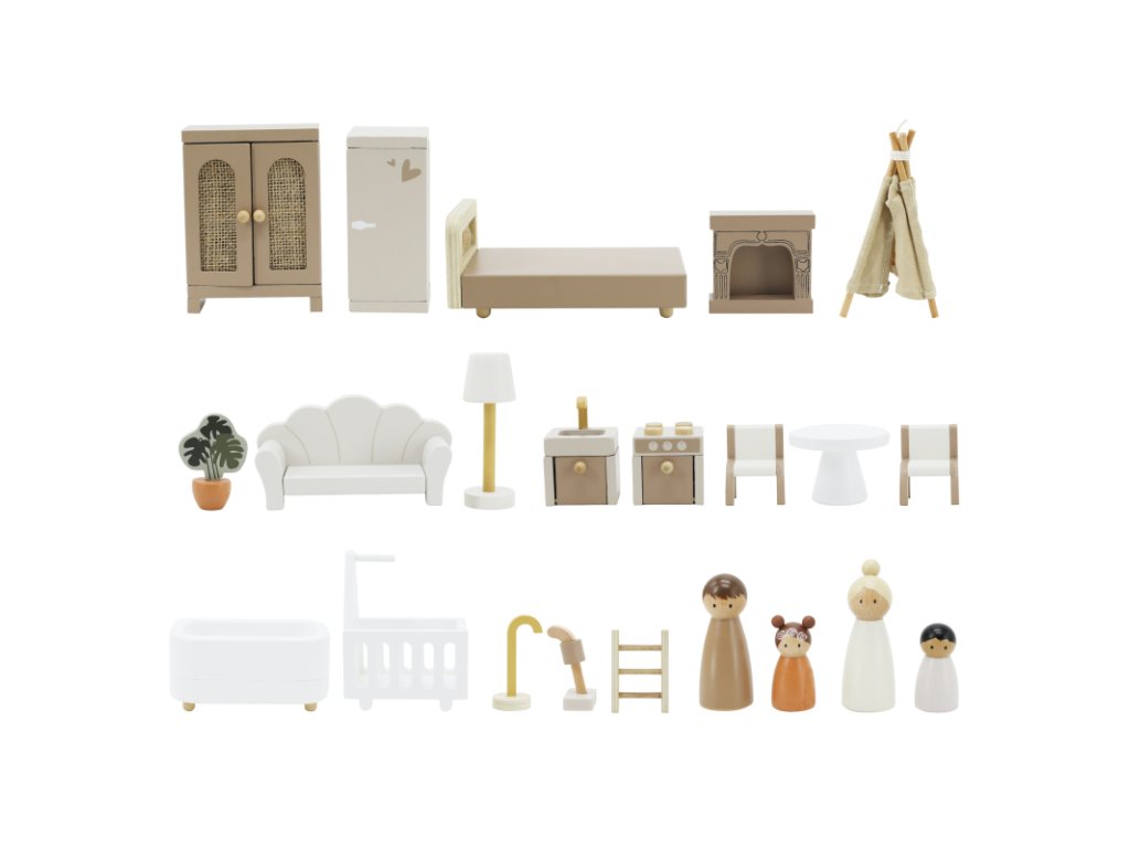Domeček je dodáván s kompletním vybavením, které děti potřebují k vytvoření vlastního malého světa. Najdete v něm šatní skříň, postel, pohovku, kuchyňku, stůl, židle, vanu, vysavač a mnoho dalšího.