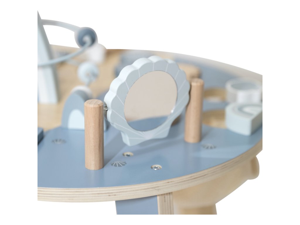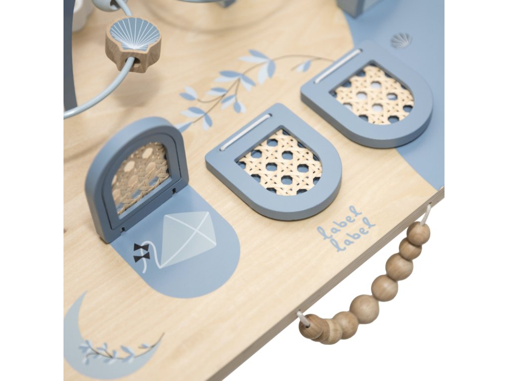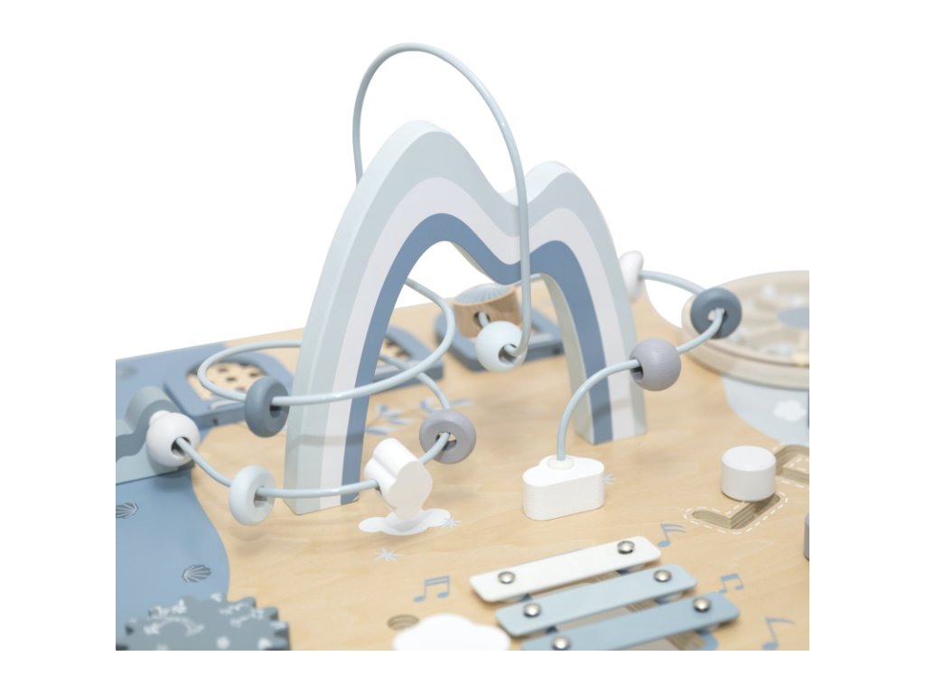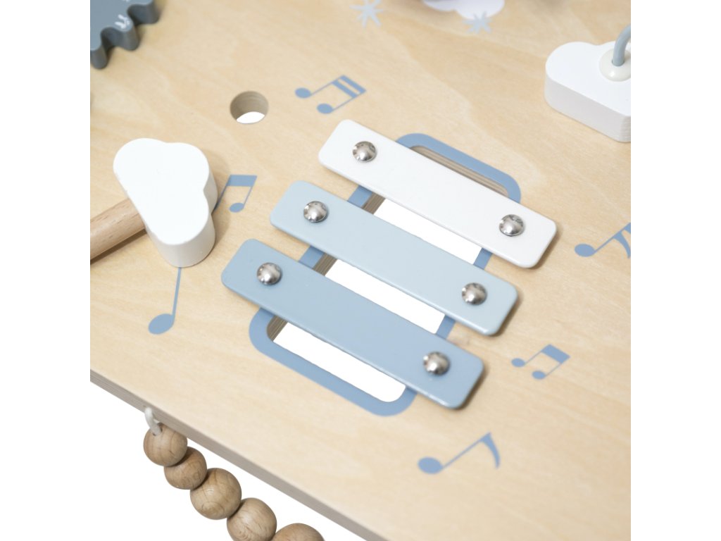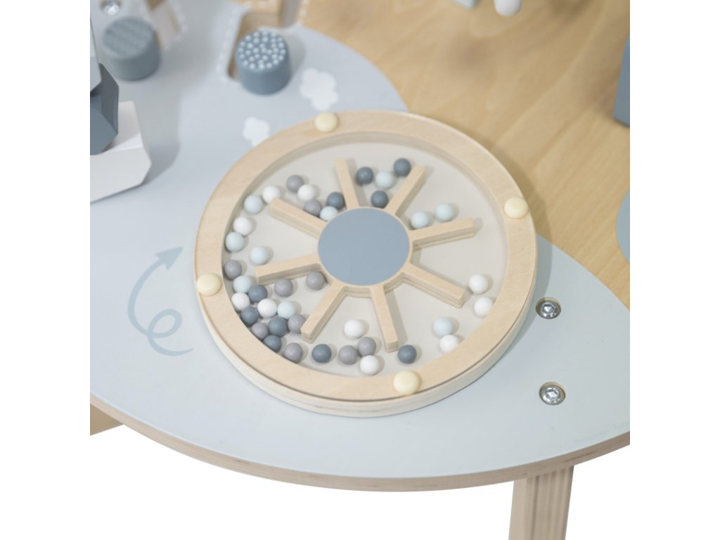 Aktivity jako otevírací okénka Peek-a-Boo, stohovací kostky, vkládačka tvarů, zrcátko, spirála s korálky a mnoho dalších podnětů podporují rozvoj dítěte a povzbuzují jeho fantazii.