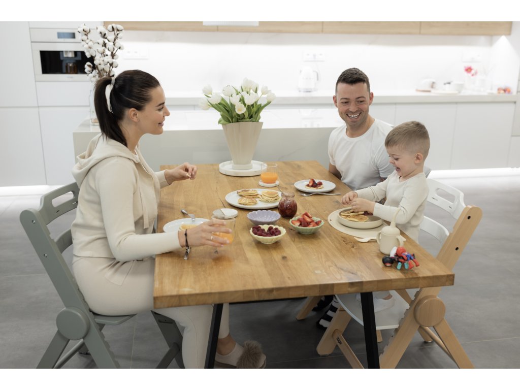 Revoluční dětská jídelní židlička "Clipp & Clapp", je designována pro dlouhodobé používání od prvních lžiček až do dospělosti s důrazem na vždy dokonale ergonomickou polohu, která podporuje zdravé držení těla při sezení a tím zdravý vývoj páteře dítěte. Židlička nabízí možnost výškově nastavit sedátko a podnožku a tím se dokonale přizpůsobí malému batoleti, které ochutnává svůj první příkrm, školákovi na cestě za poznáním při vypracovávání domácích úkolů, ale i dědečkovi, který mu s nimi pomáhá. Tato židlička je vyrobená z masivního bukového dřeva, nabízí výjimečnou odolnost a nosnost testovanou až na 110 kg, takže spolehlivě unese i dospělou osobu.