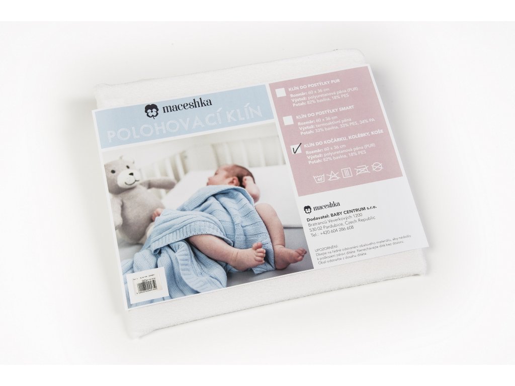 Polohovací klín Maceshka do kolébky, kočárku nebo koše se sklonem 15° snižuje riziko zalknutí nebo zadušení po kojení. Optimální sklon zamezuje ublinkávání novorozence. Díky zvýšené poloze miminko snáze vnímá okolí. Klín se možné umístit po d prostěradlo. Potah klínu je možné prát na 40°C. Materiál: 82% bavlna, 18% PES Výplň: polyuretanová pěna