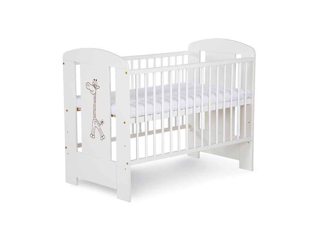 Stabilní dětská postýlka s aplikací žirafy vyrobena z borovicového dřeva.