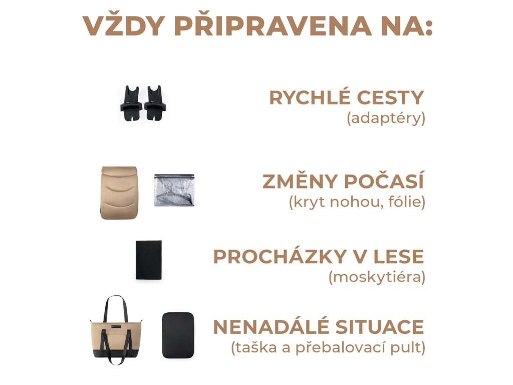 Příslušenství: taška s přebalovací podložkou, pláštěnka, nánožník, moskytiéra, matrace do vaničky, univerzální adaptéry.