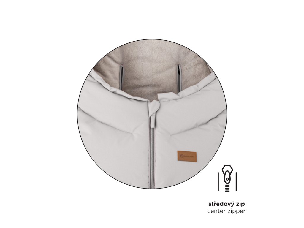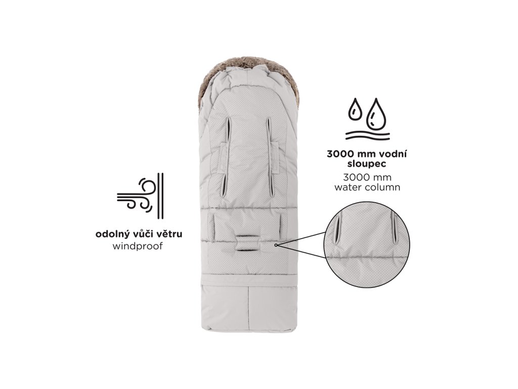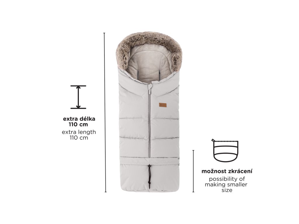 - 4v1 – odepnutím spodní části změníte velikost fusaku na menší, který se hodí i do vaničky nebo autosedačky, a připevněním kožešinky – získáte ochranu proti větru.