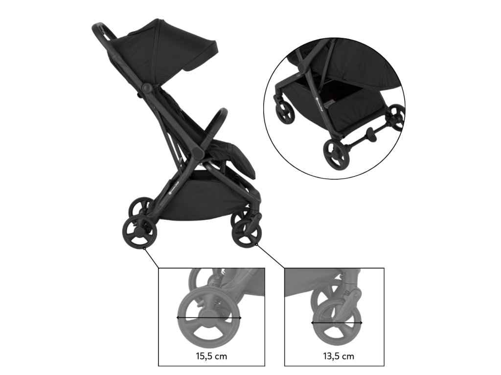 Odpružená PU kola (přední s možností otočení o 360°; přední 13,5 cm, zadní 15,2 cm) zajišťují plynulý pohyb ve městě i v mírném terénu.