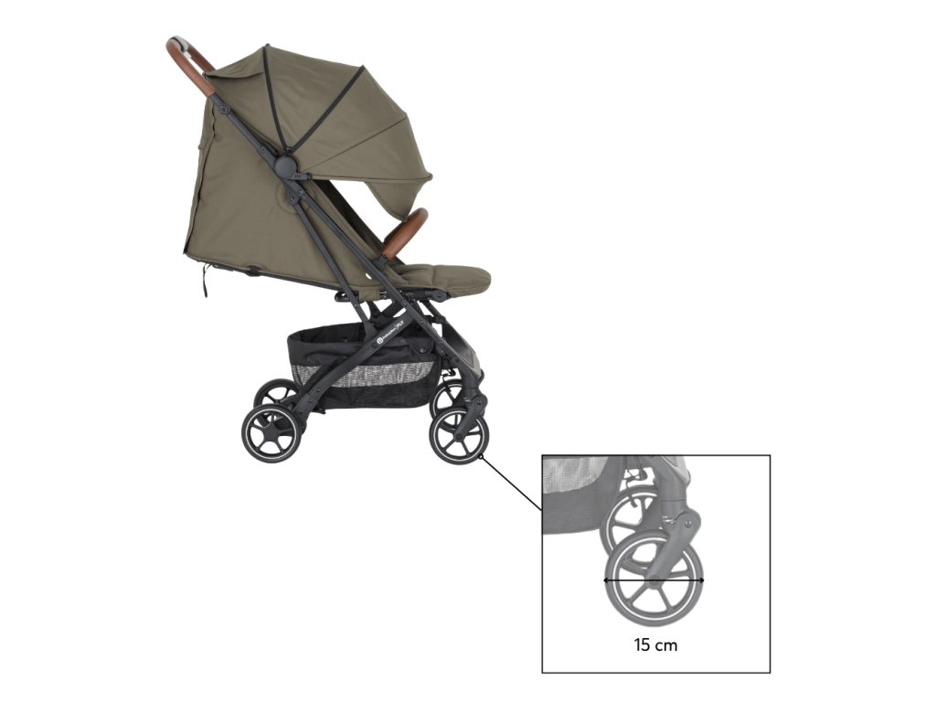 Odpružená, plně otočná přední kola zajistí hladkou a pohodlnou jízdu, s kočárkem se velmi dobře manévruje. Odnímatelné madlo usnadňuje rodičům přístup k děťátku a usnadňuje vkládání a vyjímání děťátka z kočárku.