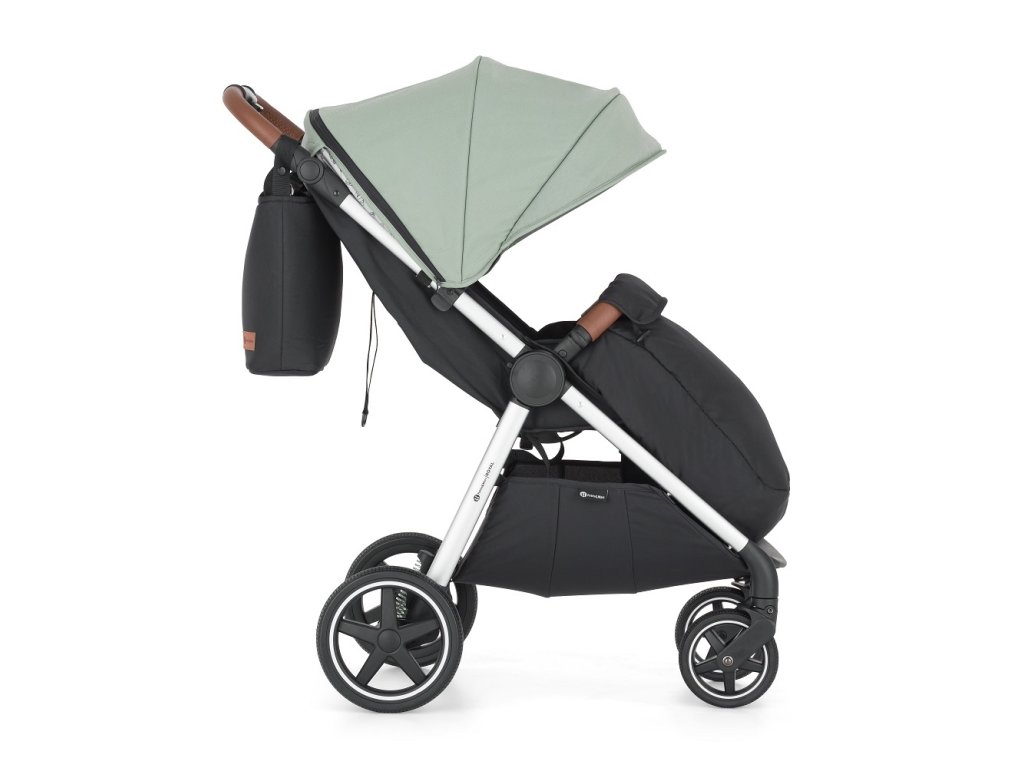 - Konstrukci kočárku ve stříbrné barvě s madlem a rukojetí v hnědé eko-kůži