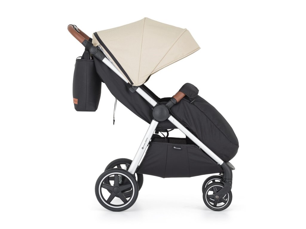 - Konstrukci kočárku ve stříbrné barvě s madlem a rukojetí v hnědé eko-kůži