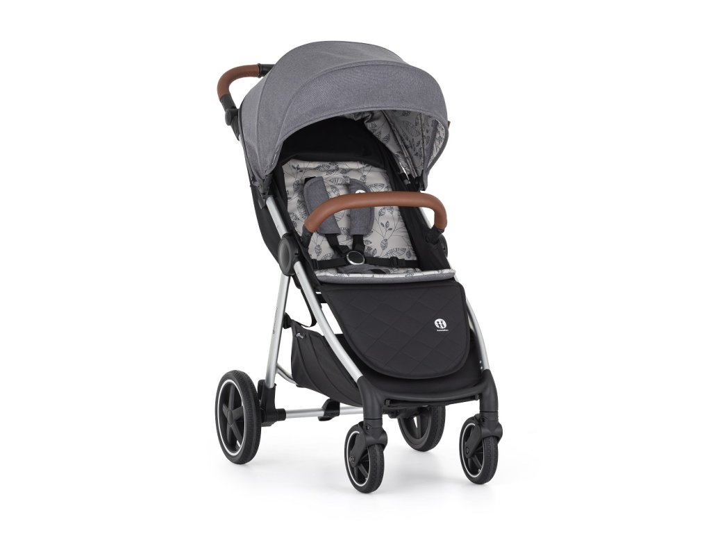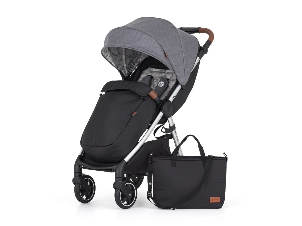 - Konstrukci kočárku ve stříbrné barvě s madlem a rukojetí v hnědé eko-kůži