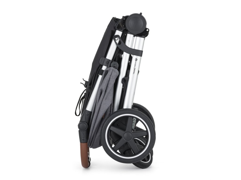 Inovovaná konstrukce kočárku Royal3 ve stříbrné barvě.