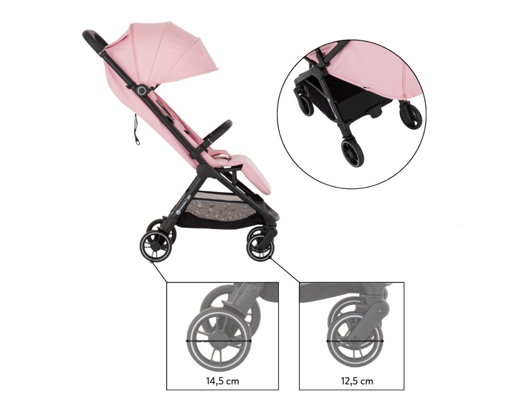 - Rozměry složeného kočárku: 55 cm (délka) × 43 cm (šířka) × 24 cm (výška)