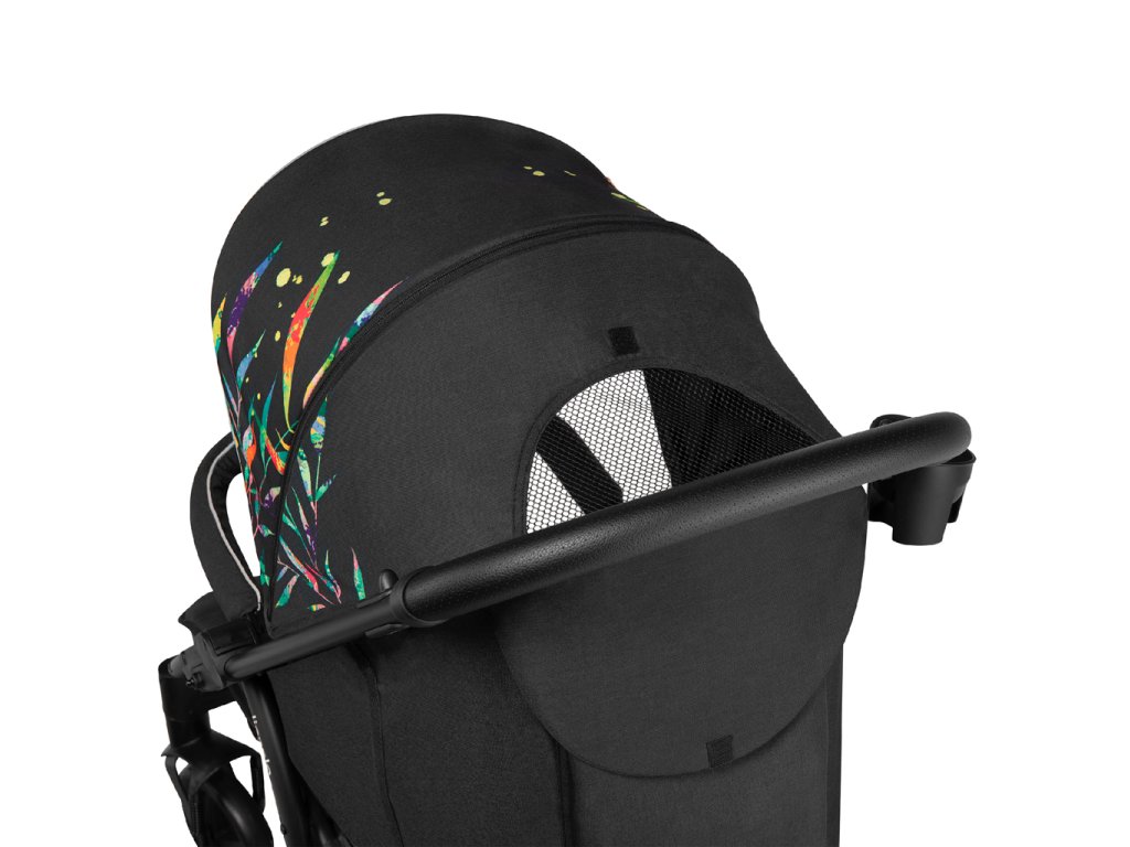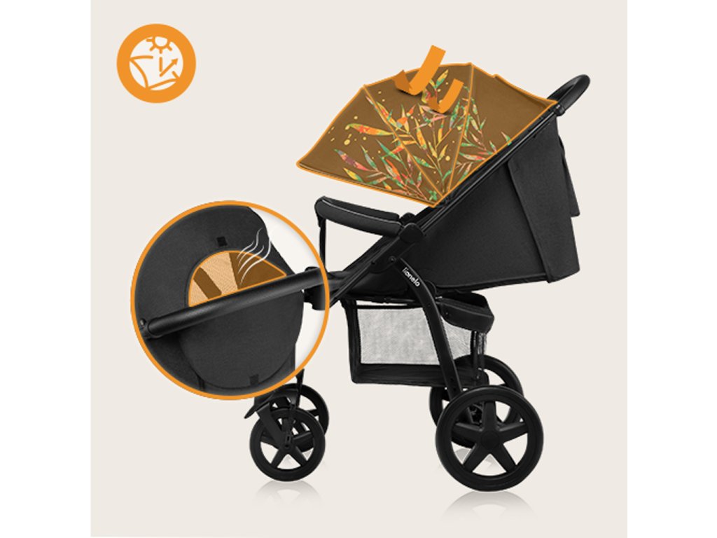 Funkční kola: Velká, bezúdržbová a pevná kola z EVA pěny umožňují pohodlnou jízdu i na náročnějším povrchu. Aretace kol pro přímou jízdu usnadňuje překonání obtížných terénů. Odpružení nacházející se jak v přední, tak i zadní části kočárku zaručuje pohodlí i při jízdě po nerovném povrchu.