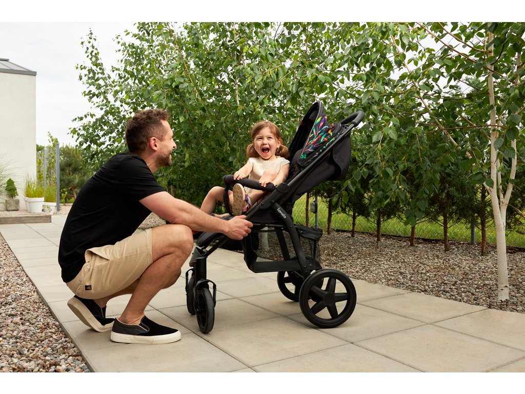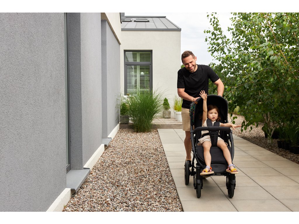 Pohodlí pro dítě: Prostorné sedadlo v kombinaci s 3stupňovým nastavením opěradla přispívají k tomu, že dítě může v kočárku volně odpočívat. Samotné opěradlo lze nastavit do polohy vleže, která umožňuje zdřímnutí. Navíc 6stupňové nastavení výšky opěrky nohou umožňuje dítěti zaujmout ergonomickou a stabilní polohu. V sadě je navíc moskytiéra, nánožník a držák na hrnek, které zvyšují pohodlí na každé procházce.