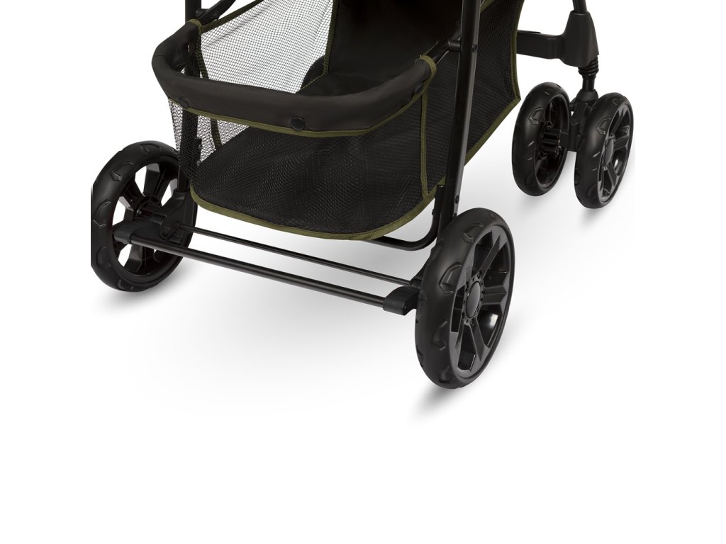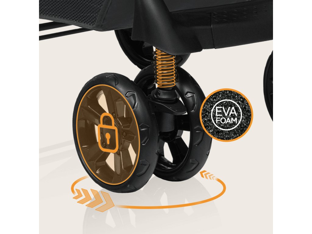 Bezúdržbová kola: Kola s dlouhou výdrží z pěny EVA jsou jsou odolná proti propíchnutí a není třeba je hustit. Proto je kočárek připraven na procházku, kdykoli ho potřebujete! Přední kola jsou vybavena odpružením nárazů a blokováním zatáčení, což usnadňuje houpání při usínání.