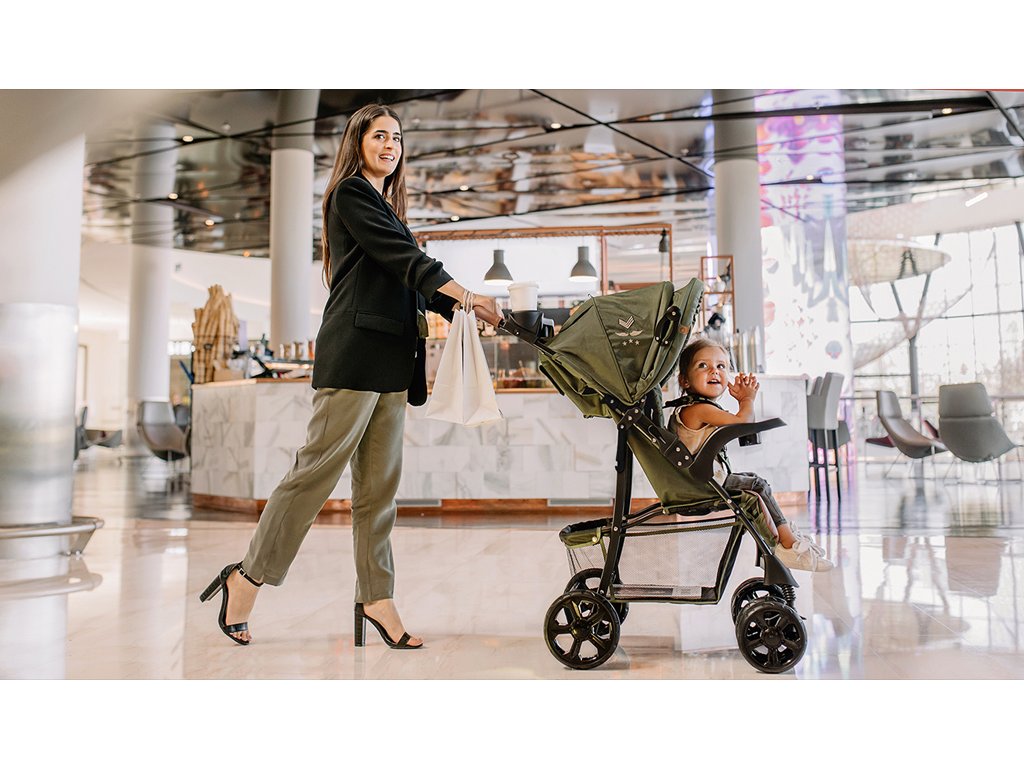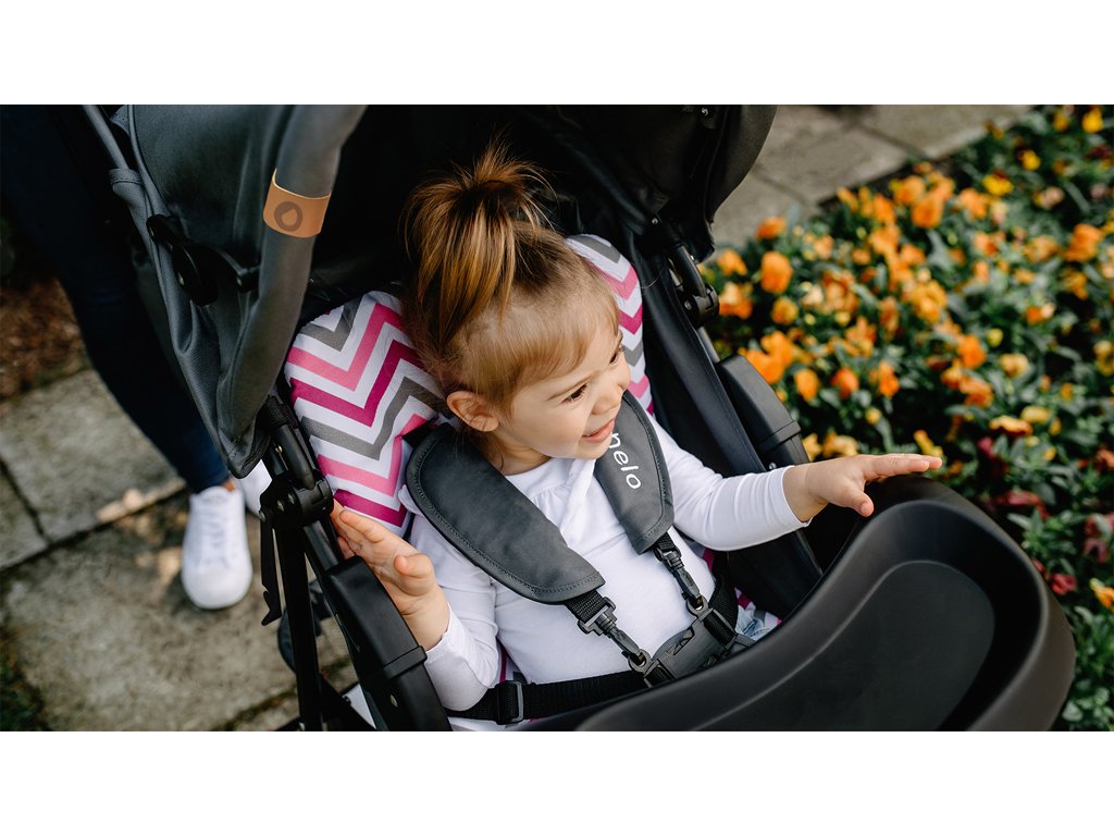 - Praktická řešení pro zlepšení péče o dítě: nastavitelná opěrka zad usnadňující usínání; taška, prostorný košík a organizér.