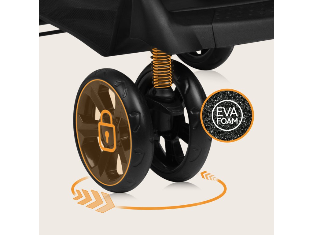 Bezúdržbová kola: Kola s dlouhou výdrží z pěny EVA jsou jsou odolná proti propíchnutí a není třeba je hustit. Proto je kočárek připraven na procházku, kdykoli ho potřebujete! Přední kola jsou vybavena odpružením nárazů a blokováním zatáčení, což usnadňuje houpání při usínání.