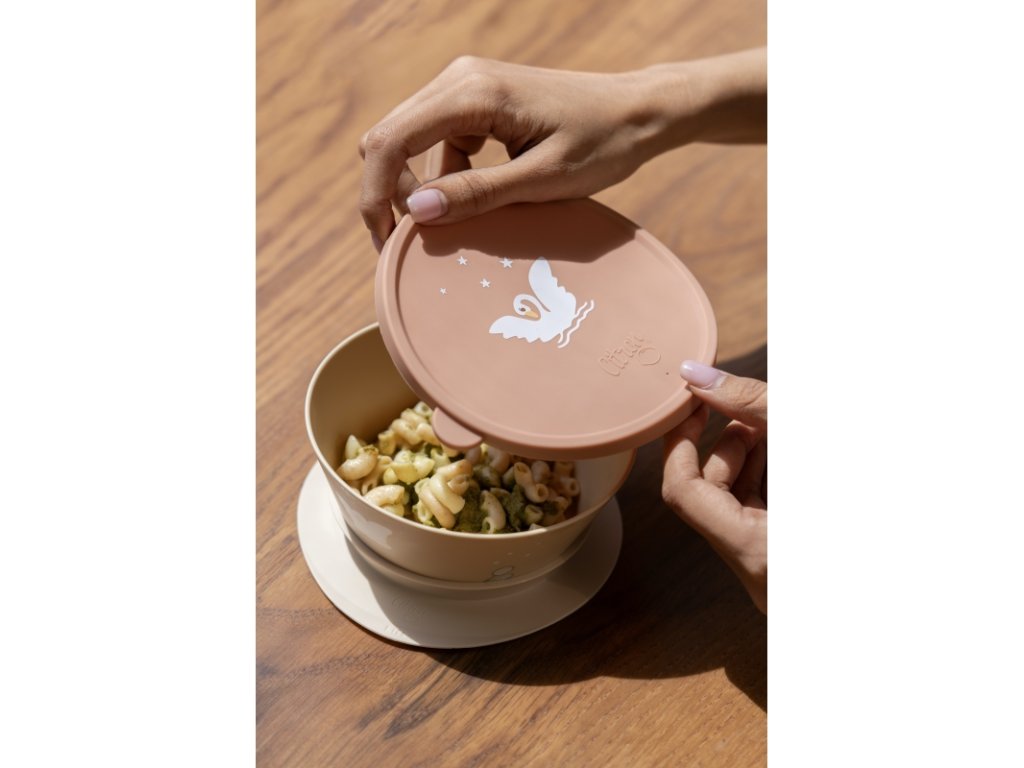 Silikonový kryt na misku, který udrží potraviny déle čerstvé. Díky své velikosti je vhodný pro použití na naše misky z BIO materiálu, ale i na většinu průměrně velkých dětských misek.
