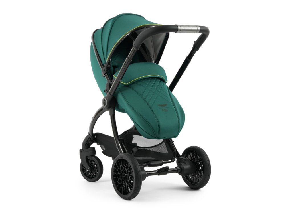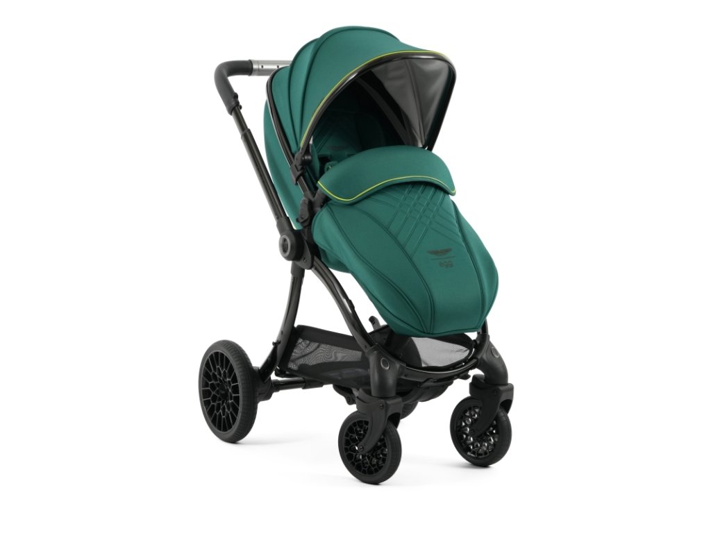 - Charakteristická zelená melírovaná tkanina Aston Martin s limetkovým lemováním. Extra velká stříška s ochranou UPF 50+ a integrovaným ventilačním okénkem, ozdobená silikonovým logem Aston Martin a decentními koncovkami zipů.