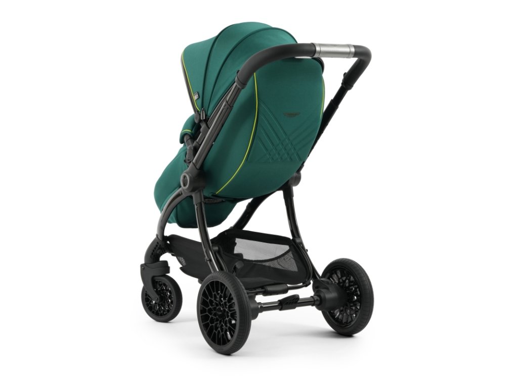 Lesklý černý rám kočárku Aston Martin egg3® Performance Green doplňuje elegantně přepracovaný, stříbrný rýhovaný středový kloub, inspirovaný ikonickými otočnými ovladači interiérů vozů Aston Martin. Tento detail dodává kočárku nádech autentické automobilové preciznosti. Kola s plástvovou strukturou, inspirovaná modely Aston Martin Valour a Victor, se dokonale snoubí s technologií Tru-Ride®, která přináší plynulou, tichou a sebejistou jízdu na každém povrchu. Celkové odpružení, volitelně otočná či aretovatelná přední kola a velkorysý úložný košík pak zajišťují praktičnost a komfort pro každodenní použití.