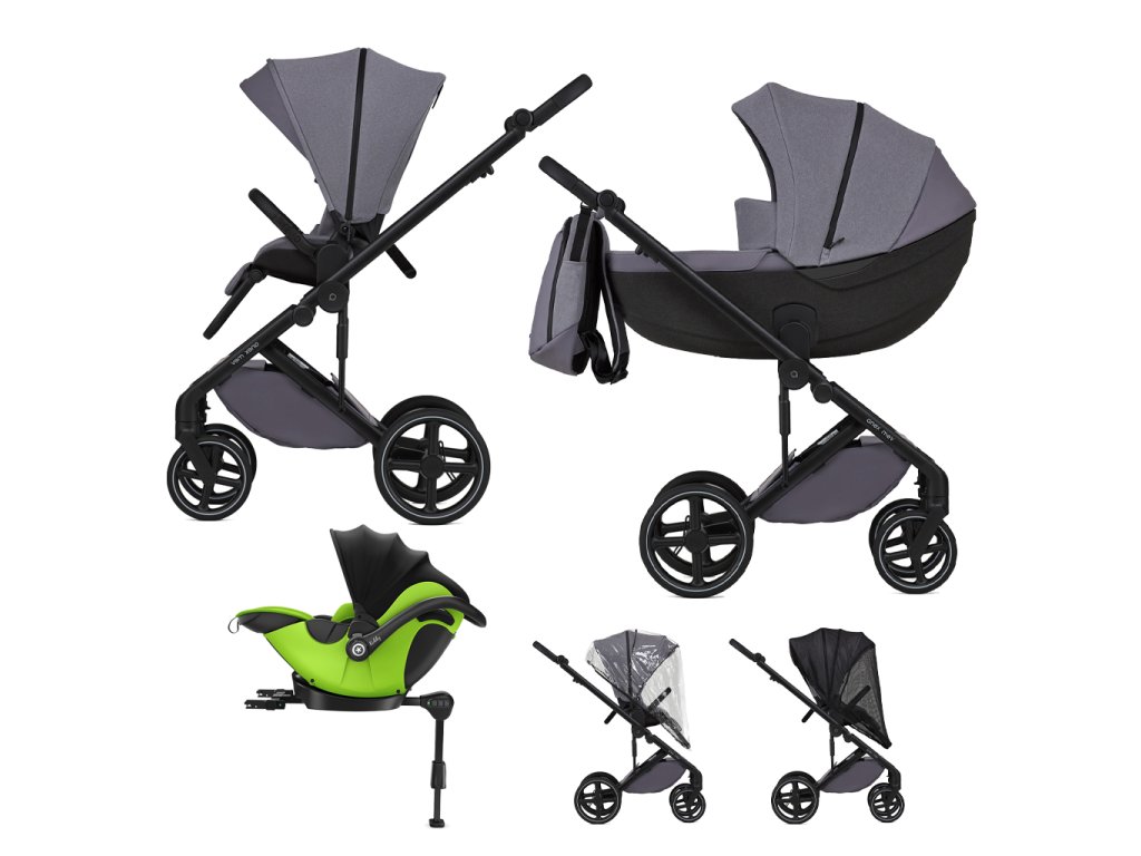 Obsahuje: korbičku, sportovní část, zvyšovací adaptéry, elegantní batoh, pláštěnku, moskytiéru, madlo. Součástí kočárku je také autosedačka Kiddy Evoluna i-size 2 spolu s isofix základnou.