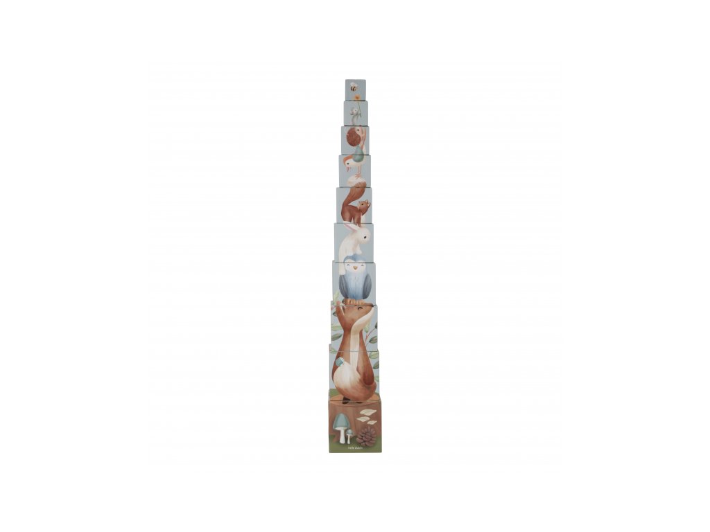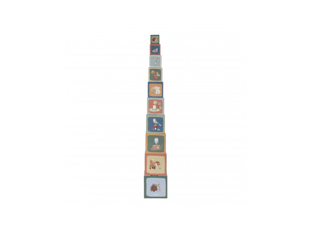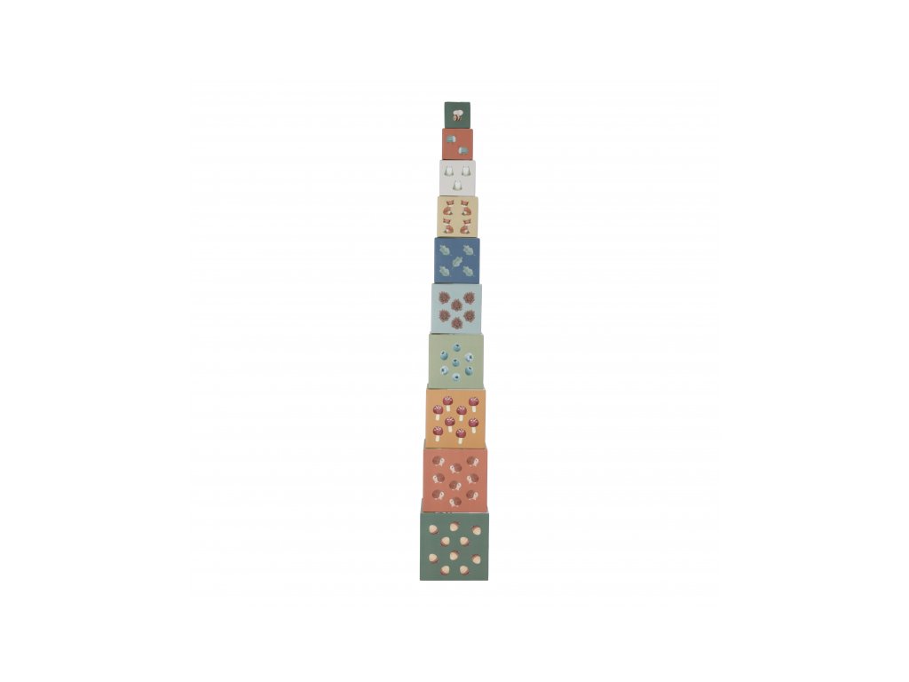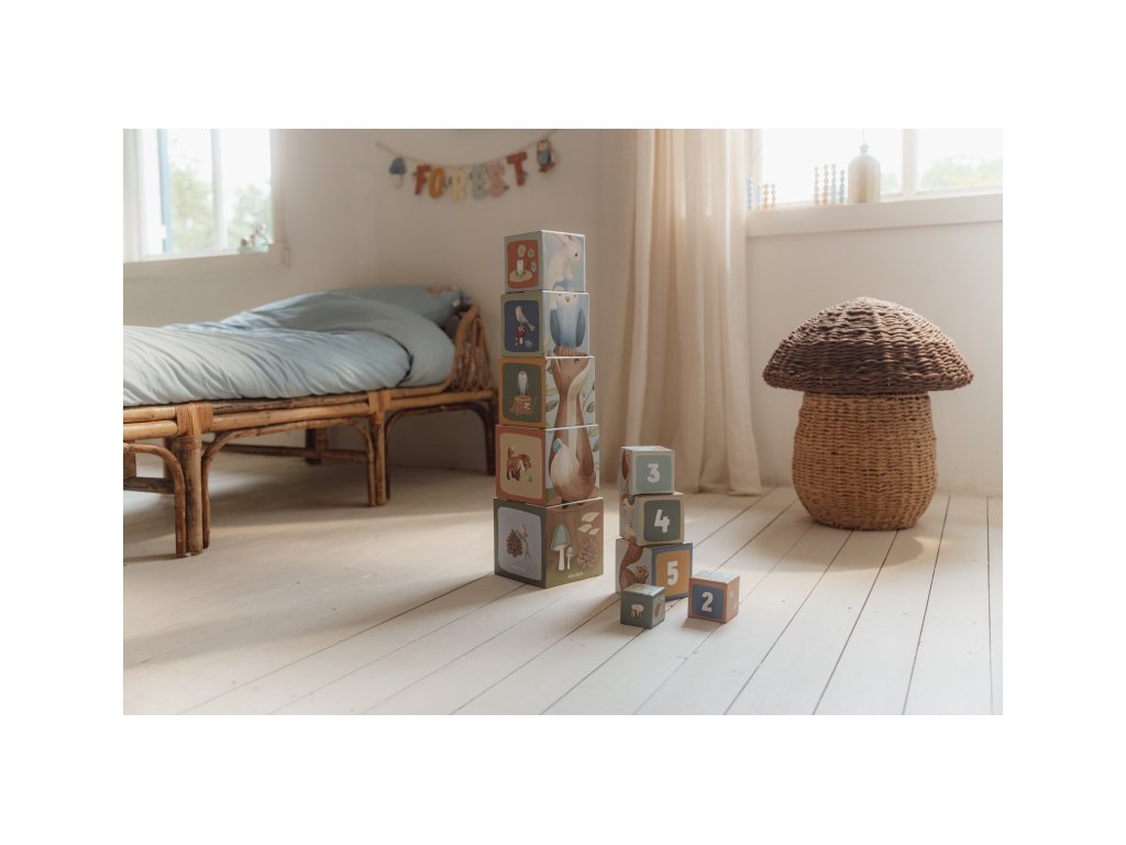 Barevné kartonové kostky s krásnými ilustracemi motivů ze života v lese. Nechte vaše dítě kostky skládat na sebe do vysoké věže nebo vedle sebe podle velikosti. Ve starším věku se dítě s pomocí očíslovaných kostek může hravým způsobem učit počítat i rozpoznávat číslice.