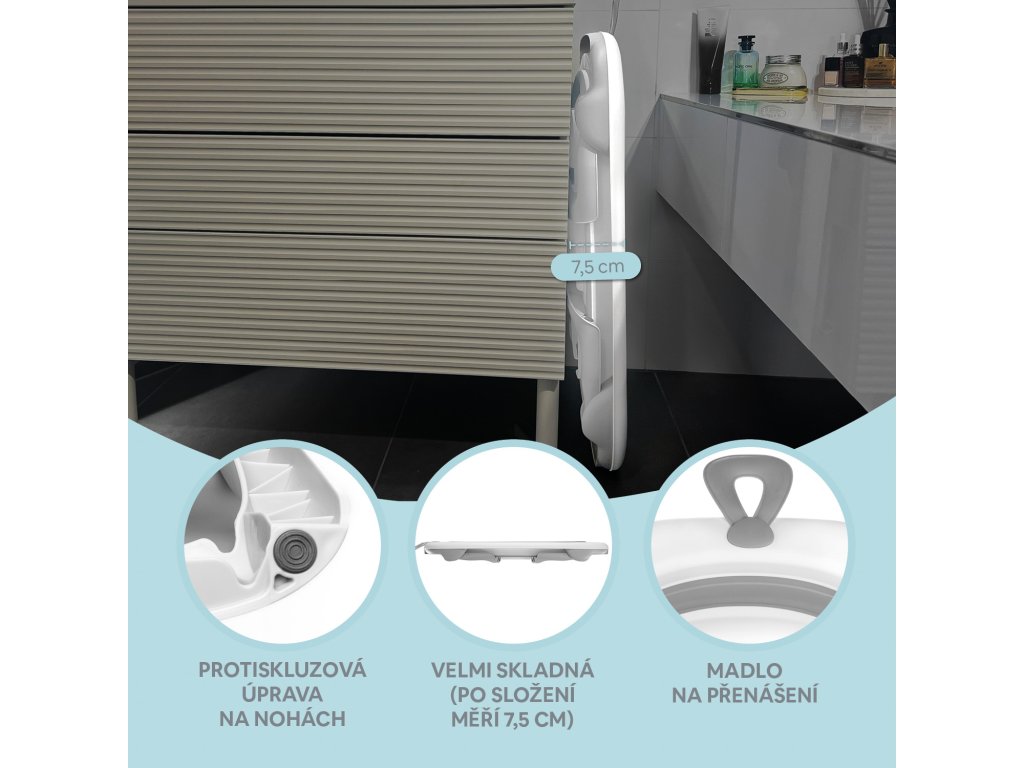 snadno přenosná a nezabírá místo, když ji nepoužíváte. Ačkoliv je vanička ve