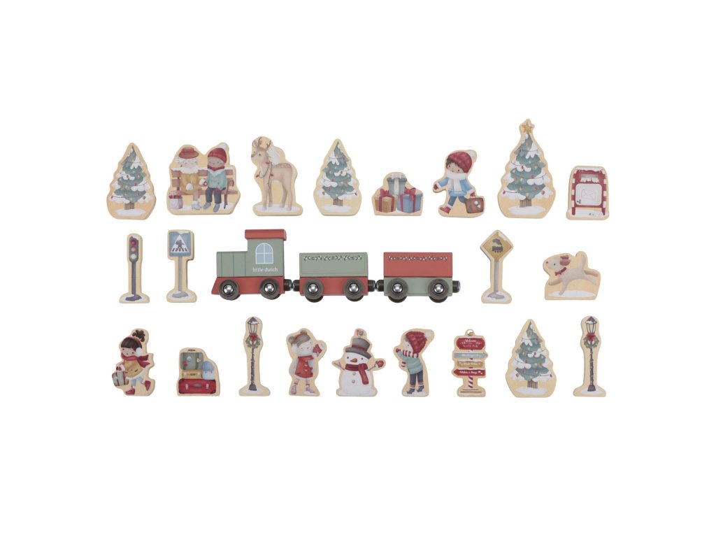 - 24 dřevěných překvapení - každý den v prosinci objeví dítě nový dílek – lokomotivu, stromek, soba, sněhuláka, kufry, dopravní značky a další doplňky, které společně vytvářejí kouzelnou vánoční scénu