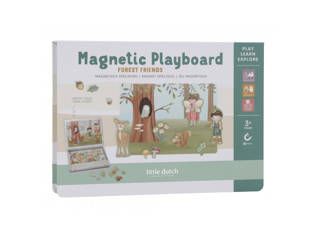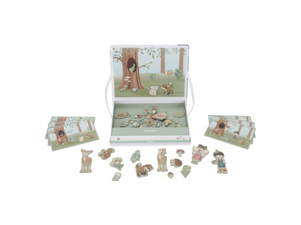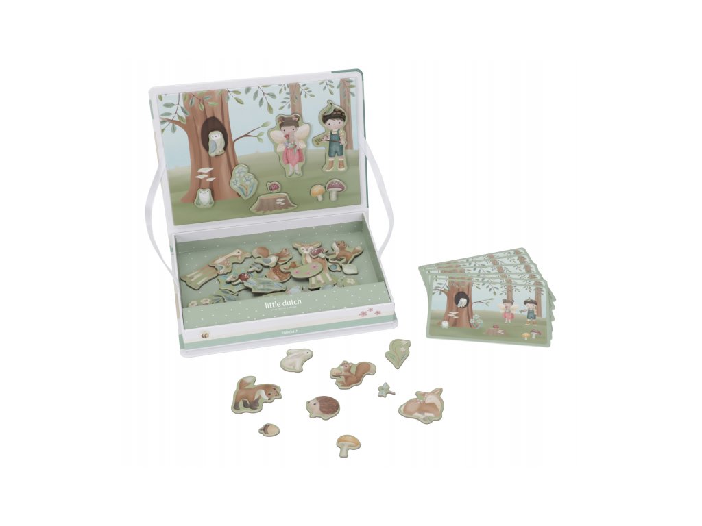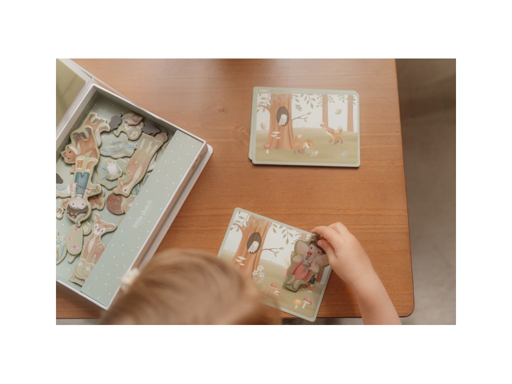 Magnetická hra se skládá z magnetických dílů s motivy ze života v lese a 6 vzorových karet. Magnetické víko lze použít jako herní desku.