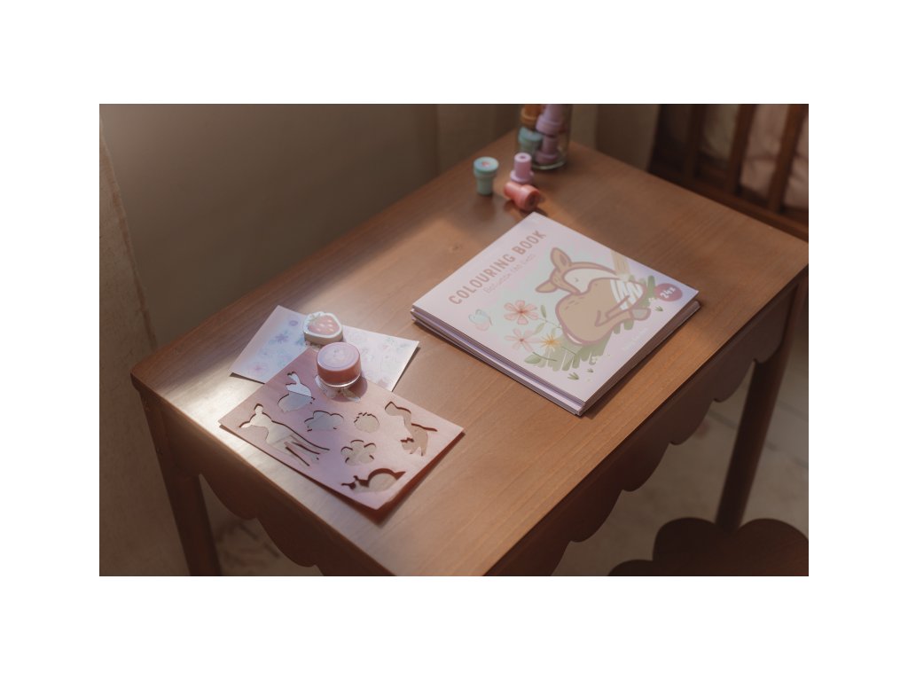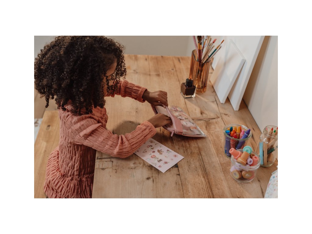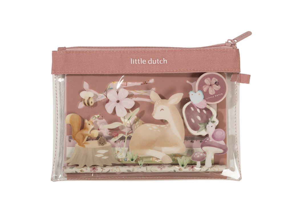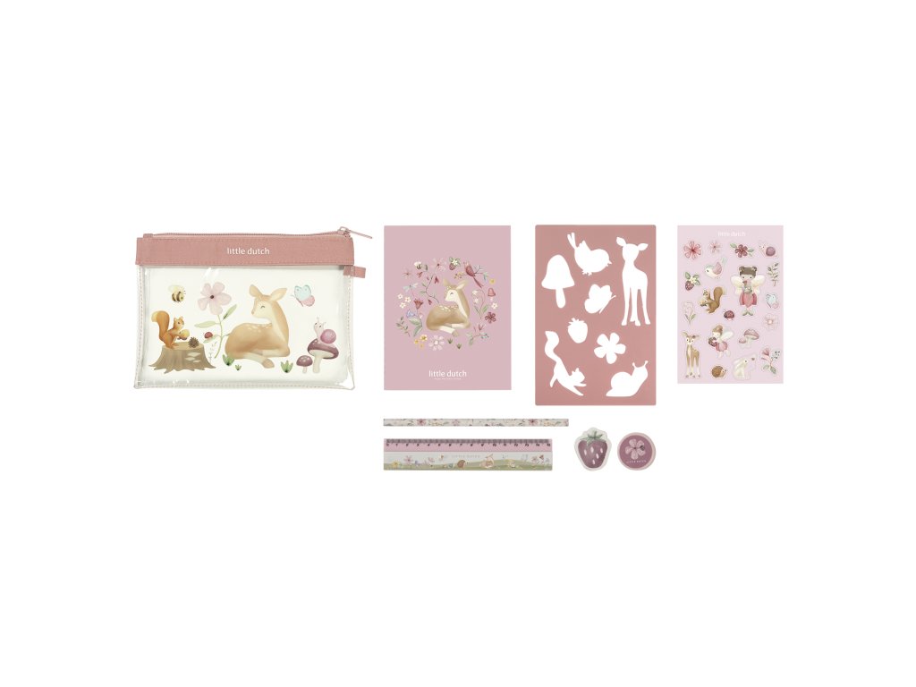 Sada výtvarných potřeb v krásném provedení s motivy na zahradě v lese obsahuje průhledné pouzdro na zip, sešit, samolepky, pravítko, gumu, ořezávátko a šablony.