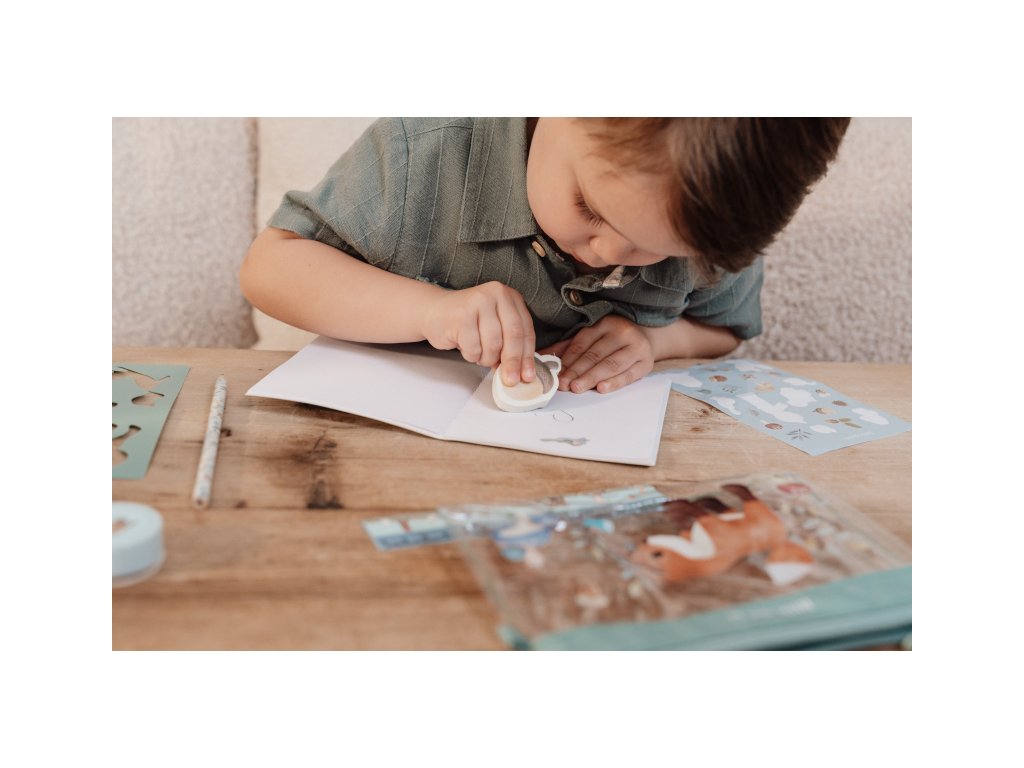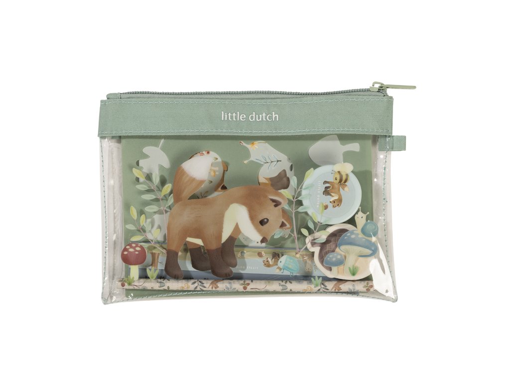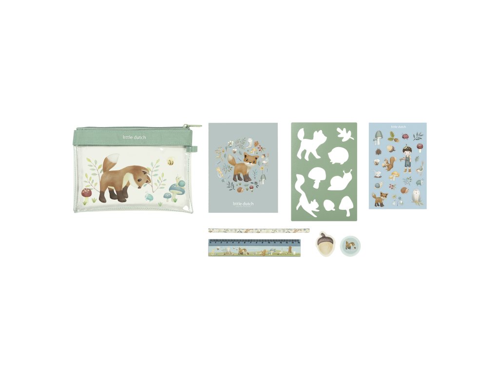 Sada výtvarných potřeb v krásném provedení s motivy života v lese obsahuje průhledné pouzdro na zip, sešit, samolepky, pravítko, gumu, ořezávátko a šablony.