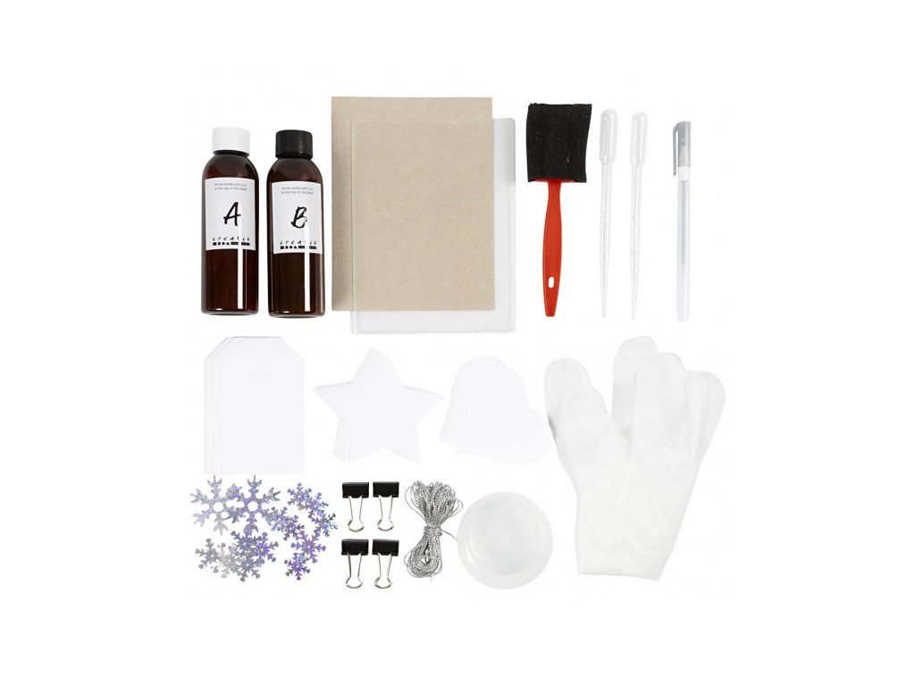 Složky cyanotypie A + B, papírové štítky, stříbrný fix, flitry, šňůrka, plastová fólie s podložkou, klipy, kovová dóza, pěnový štětec, pipeta a rukavice