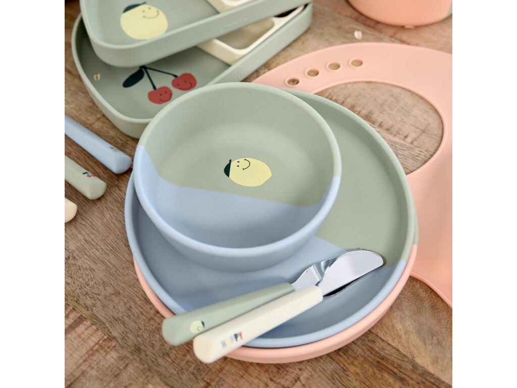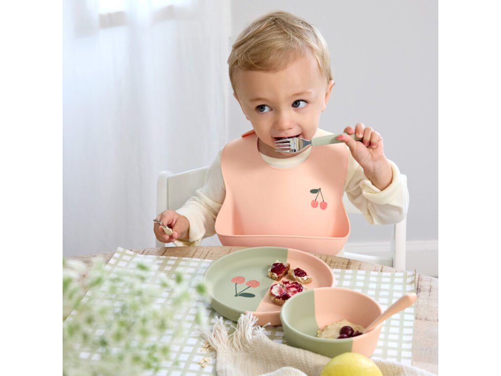 Dětský příbor se silikonovou rukojetí je skvělým pomocníkem při stolování a prvních pokusech vaší ratolesti se vlastnoručně nakrmit. Společně se samostatně dostupnou silikonovou sadou nádobí jsou děti připraveny na všechna jídla.