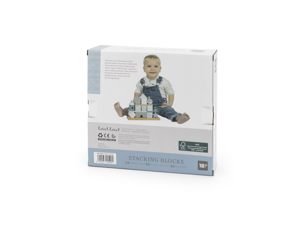 Tento mini domeček se skládá ze 4 řad dřevěných kostek ve stylu Label Label. Najdete zde základnu, 8 dřevěných tyček, 3 podkladové desky a 14 kostek různých tvarů a s různými barevnými odstíny, symboly a vzory, ze kterých si vaše dítě může postavit domeček podle vlastní fantazie.