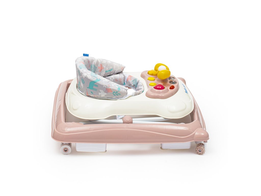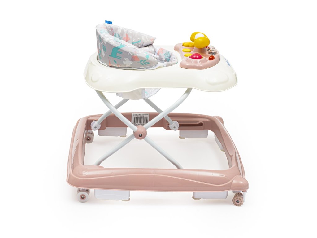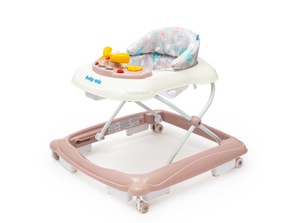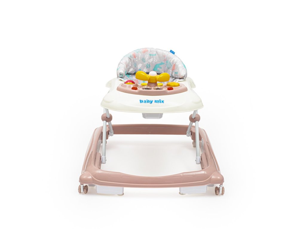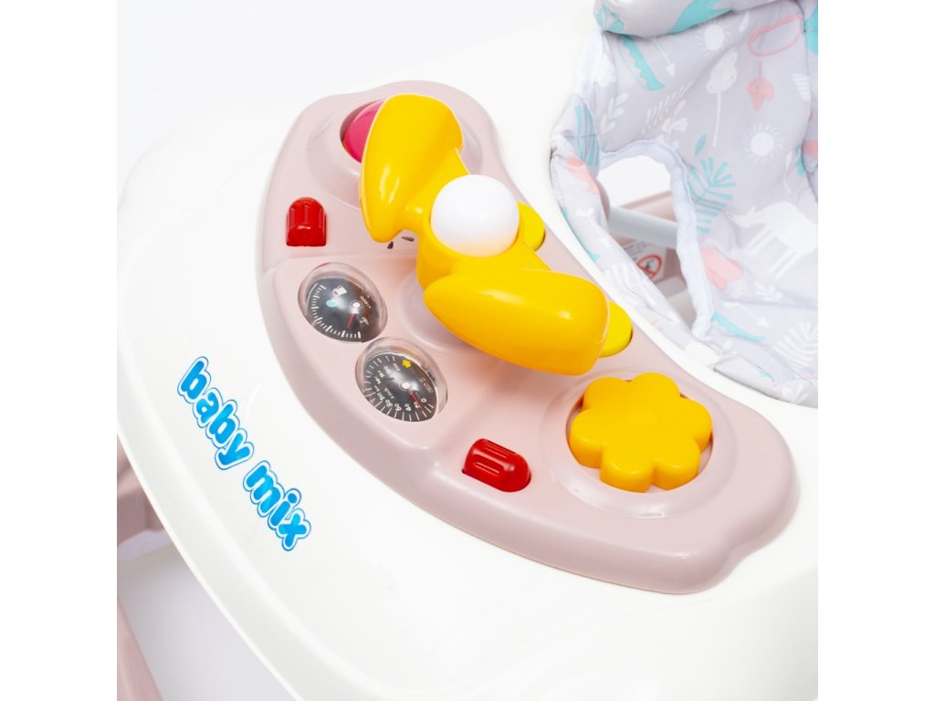 Multimediální chodítko Baby Mix se silikonovými kolečky. Chodítko je vybaveno pohodlným ergonomicky tvarovaným sedadlem, které zajišťuje správné držení páteře. Multimediální panel obsahuje různé světelné efekty, troubící volant, kterým lze otáčet, tlačítka pro přehrávání melodií a dvě světla. Krásné chodítko s hračkami okouzlí malé objevitele a umožní jim hrát si ještě déle. Chodítko je vybaveno speciálním systémem proti převrácení, který zajistí Vašemu dítěti pohodlí a bezpečnost.