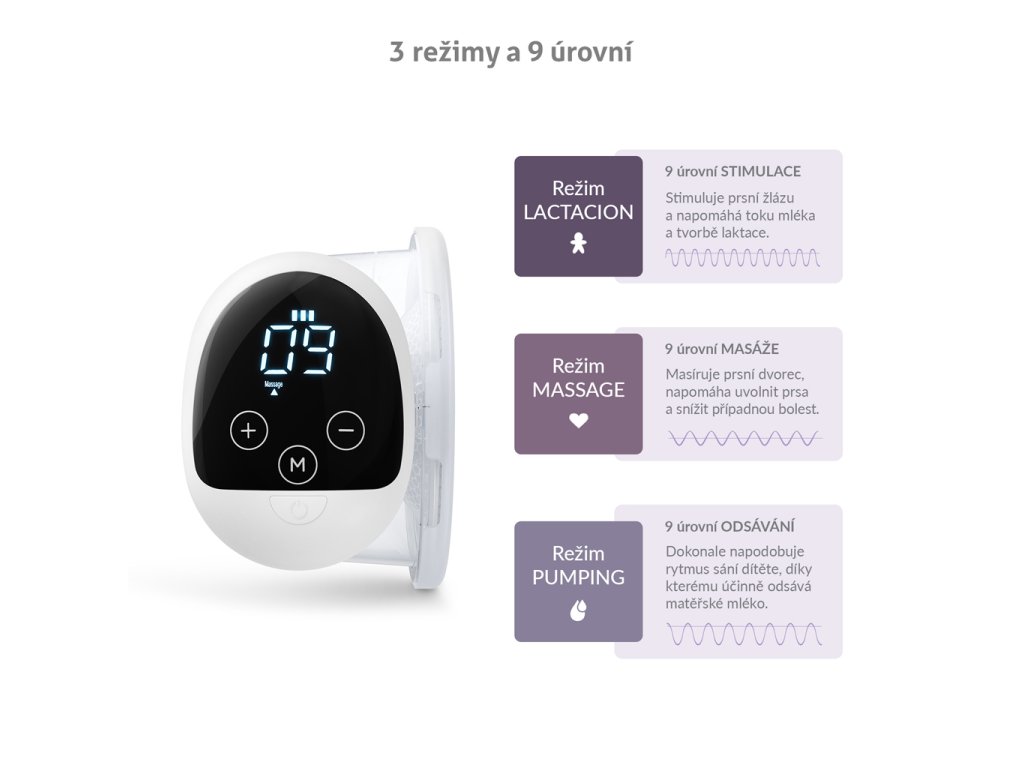 - Její 3 režimy zajistí stimulaci prsní žlázy pro podporu laktace a toku mléka, masáž uvolňující prsa a odsávání mateřského mléka v rytmu napodobujícím sání dítěte.