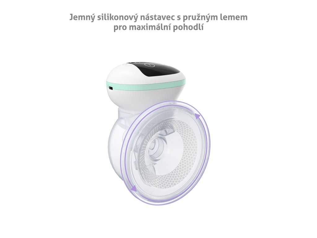 - Přiložení odsávačky k prsu je příjemné díky měkkému nástavci z jemného silikonu, který se prsu krásně přizpůsobí a je šetrný k pokožce.