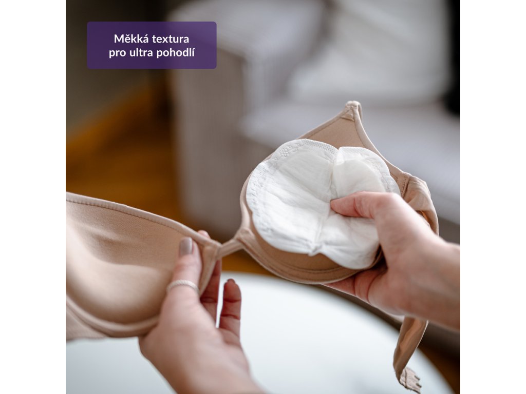 Prsní vložky s povrchem měkké textury jsou pro okolí zcela neviditelné díky tloušťce pouhých 2 mm. Při své tenkosti pojmou pohodlně až 80 ml mléka.
