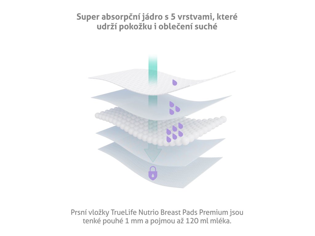 TrueLife Nutrio Breast Pads Classic tvoří 5 vrstev se super absorpčním jádrem, takže dokonale chrání přes den i v noci nejen vaše oblečení, ale především i pokožku. Ultra měkká prodyšná textura vrchní části poskytuje perfektní pohodlí a přírodní netkaná textilie zároveň udržuje pokožku v suchu. V dalších absorpčních vrstvách se nachází tkáň s funkcí rychlé absorpce, dále buničina SAP Fluff absorbující a zadržující unikající mléko, následuje tkáň ještě zlepšující funkci buničiny a konečně poslední vrstvu tvoří prodyšná a nepromokavá fólie.