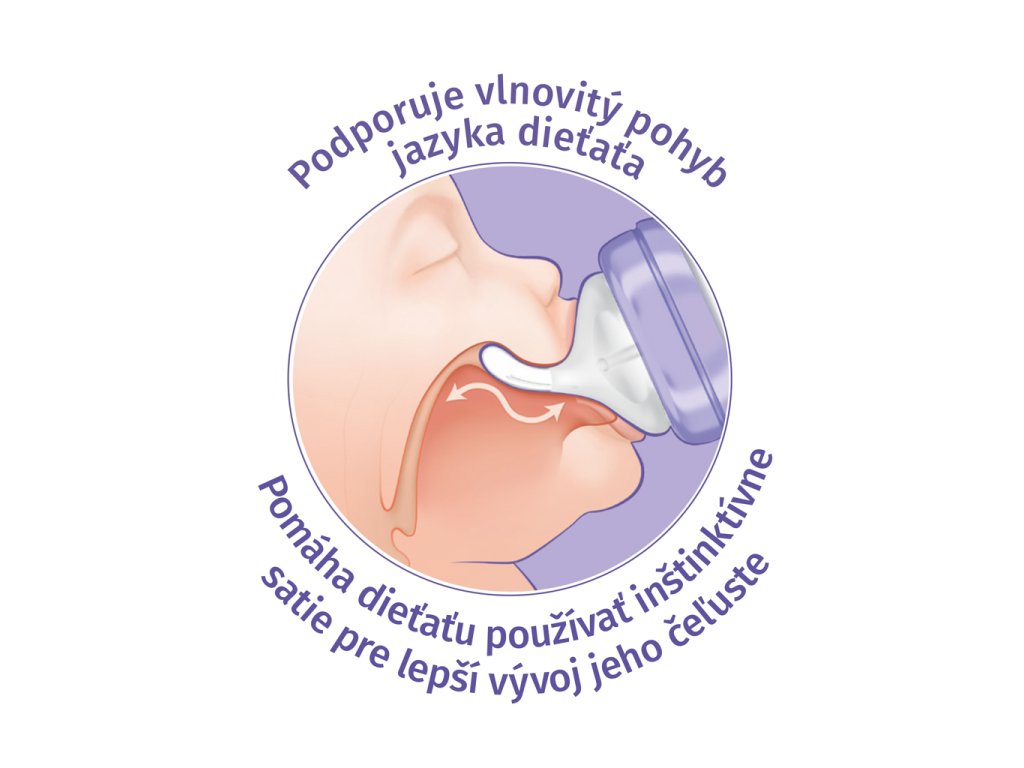 Věděli jste, že rozsáhlé výzkumy ukázaly, že dětské sání je velmi odlišné od dospěláckého a zahrnuje tři klíčové kroky. Jedná se o počáteční zachycení bradavky, peristaltický pohyb jazyka (jazyk vašeho dítěte se pohybuje vlnovitým pohybem) a polykání. Je velmi důležité, aby dítě bylo schopno provádět peristaltický pohyb jazyka, neboť podporuje přirozený orální vývoj a vývoj čelisti.