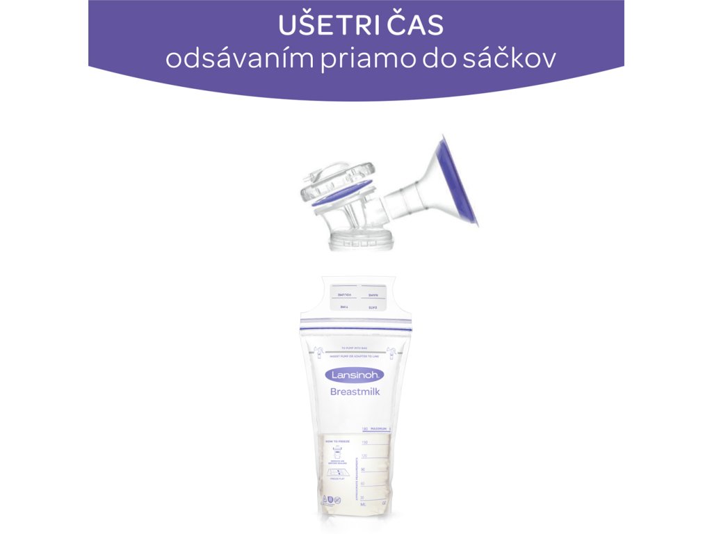S Lansinoh kompaktní single elektrickou odsávačkou lze odsávat přímo do Lansinoh sáčků na skladování mateřského mléka, což šetří čas a zamezuje vylití mléka při jeho přelévání z láhví do sáčků. Odsávání přímo do sáčků je výbornou pomocí, když jste na cestách a nemáte dostatek místa na láhve na skladování mléka.