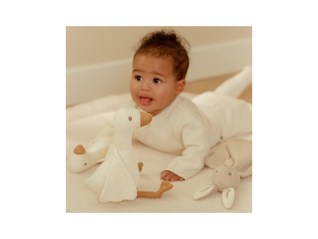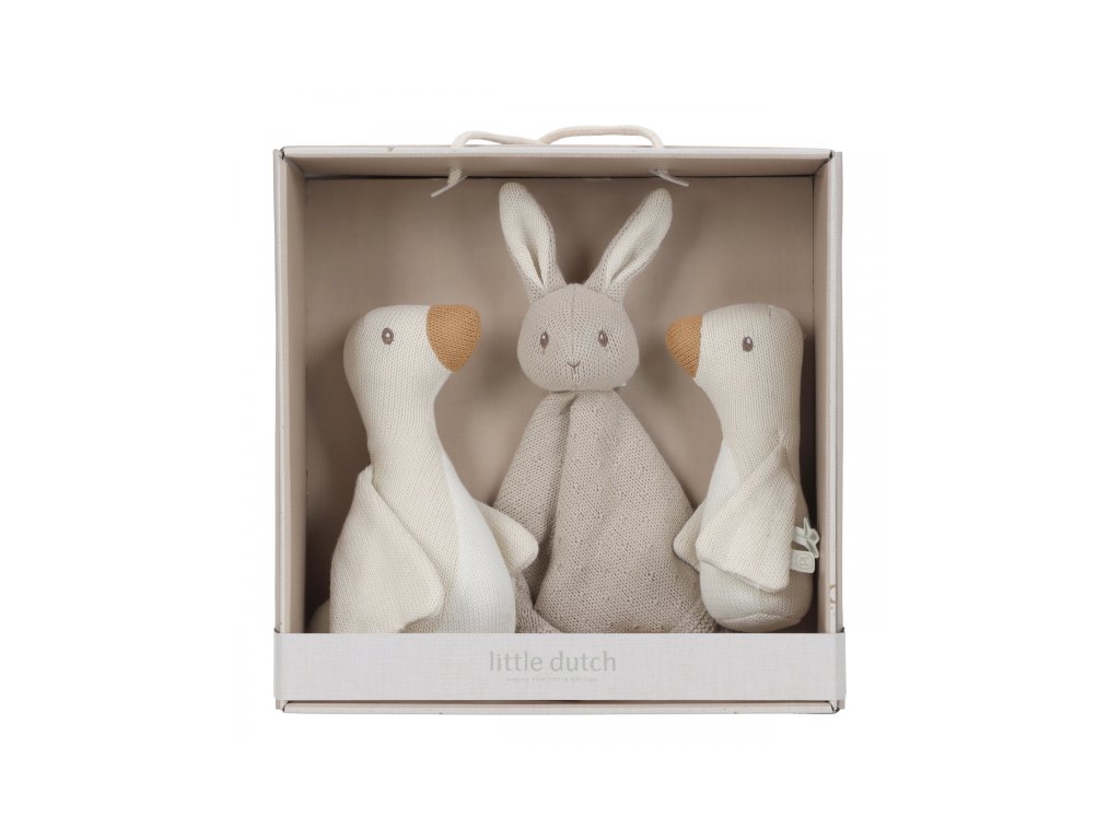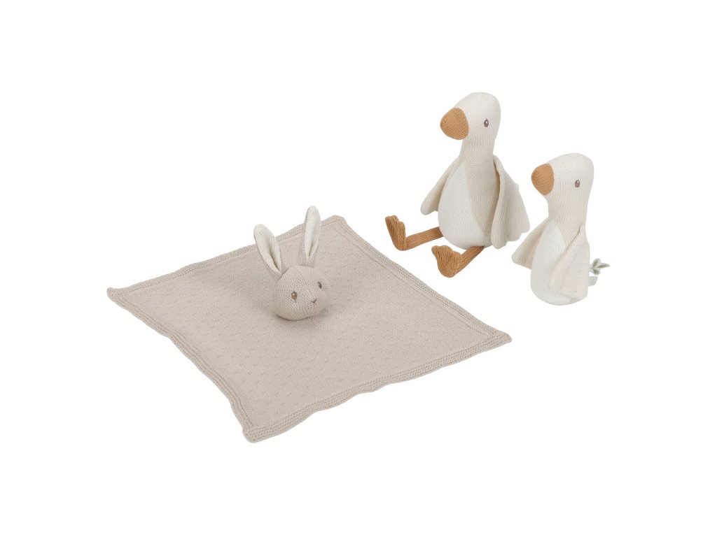 Krásná dárková sada hraček z jemné pleteniny je ideální jako dárek pro novorozené miminko. Sada obsahuje muchláčka s králíčkem a dvě hračky v podobě husy.