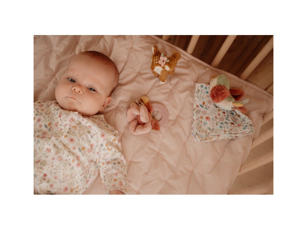 Krásná dárková sada plyšových hraček je ideální jako dárek pro novorozené miminko. Sada obsahuje kousátko s kytičkou, muchláčka s ptáčkem a plyšovou srnku.