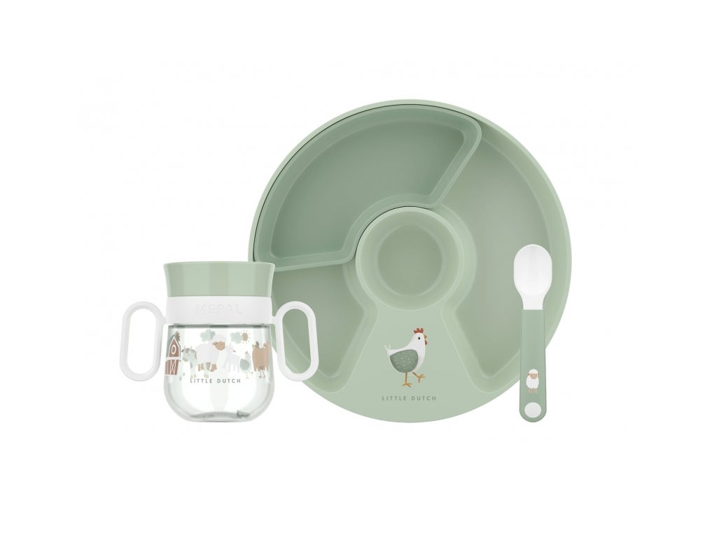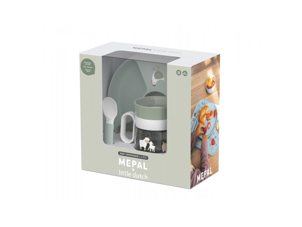 3-dílná jídelní sada v krásném designu s jemným potiskem obsahuje dětský dělený talíř, trénovací hrnek se systémem 360° a lžičku.
