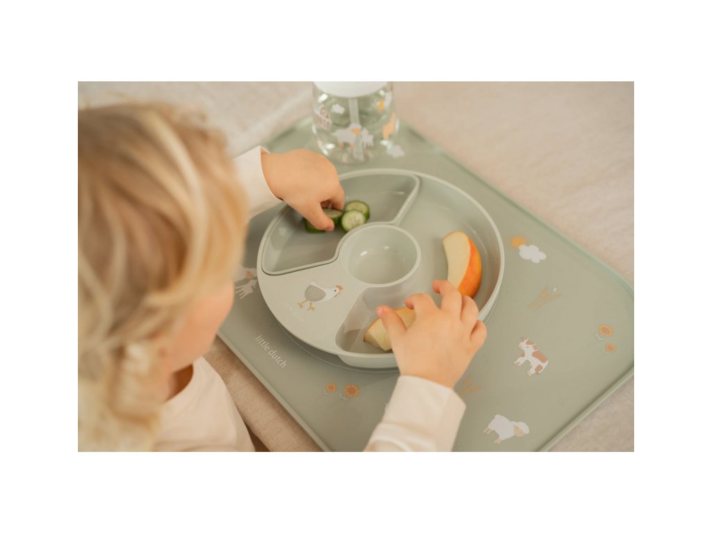 Dětský talíř s krásným potiskem má protiskluzové dno a vysoký okraj, který pomáhá dítěti jídlo nabrat na lžíci. Talíř je tak ideální pro první samostatné stolování dítěte. Vyjímatelná přihrádka umožňuje rozdělení jednotlivých částí jídla do 2, 3 nebo 4 přihrádek. Díky praktickému úchytu se talíř snadno přenáší. Je vyroben z lehkého, mimořádně odolného plastu.