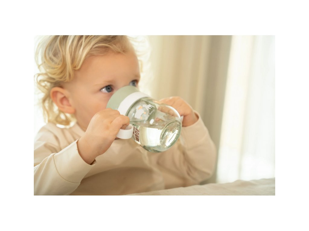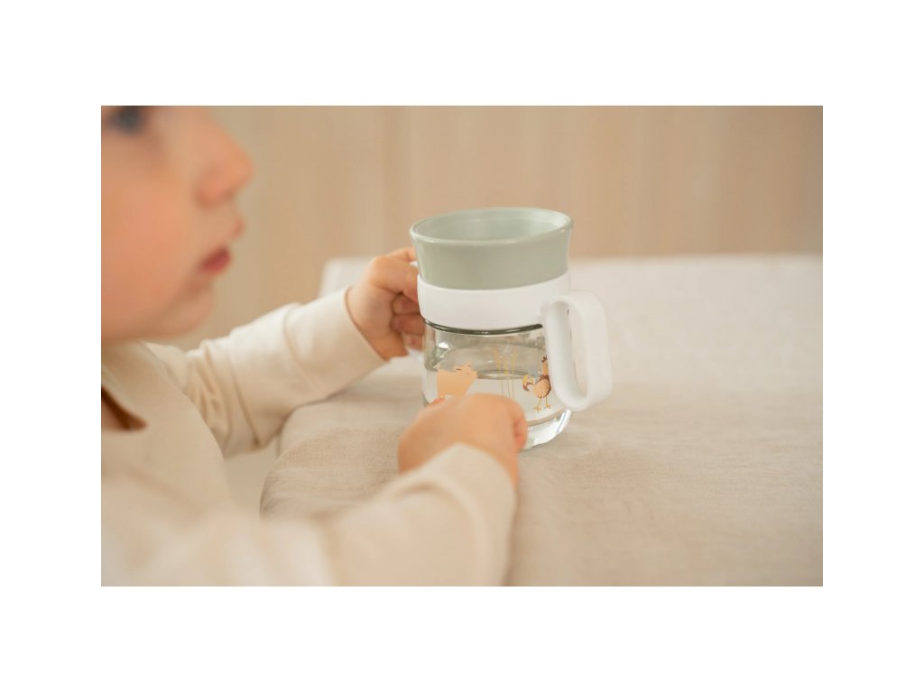 Trénovací hrnek 200 ml je ideální pro děti, které se učí pít z klasického hrnku. Silikonové víčko se systémem 360° umožňuje pít z kteréhokoli místa po obvodu hrnku bez rizika rozlití. Tekutina teče z hrnku po naklonění k ústům dítěte kontrolovaným způsobem, takže dítě na sebe při pití obsah hnku nevylije. Když pít přestane, hrnek se díky speciální membráně automaticky uzavře. Držadla usnadňují držení hrnku malými dětskými ručičkami.